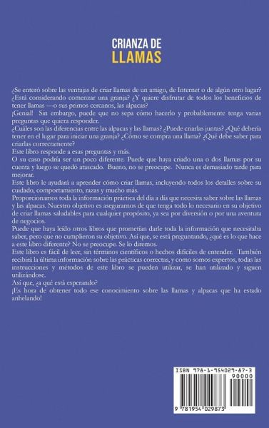 Si quiere aprender a criar llamas, siga leyendo... ¿Ha estado escuchado últimamente mucho acerca de las llamas y las alpacas? Puede que haya aprendido que son grandes mascotas y que pueden darle un buen dinero. ¿Quiere saber más sobre la crianza de estos lindos e inteligentes animales? Este libro responde a todas las preguntas que pueda tener sobre estos increíbles animales. Descubrirá...Las 7 cosas que debe saber antes de comprar su primera llama o alpaca Por qué debería empezar a criar llamas Cómo entender y manejar el comportamiento de las llamas Cómo identificar las diversas razas de llamas y alpacas Requerimientos simples y detallados de interior y exterior para albergar a las llamas Cómo manejar los cambios climáticos en sus establos e instalaciones de llama ¿Por qué escupe su llama? Enfermedades peligrosas que afectan a las llamas y las alpacas Aprenda qué hacer cuando su llama está dando a luz Cómo cuidar de una llama recién nacida 10 consejos útiles para su negocio con las llamas ¡Y mucho más! Con este libro como guía, puede tener su ganado de llamas o alpacas por razones prácticas (carga), tenerlas como mascotas, o usarlas en su negocio de lana. Las instrucciones y consejos contenidos en este libro son claros, prácticos y fáciles de seguir. Desde su primera compra hasta el nacimiento de las crías, este libro será un útil compañero. ¡Adquiera este libro ahora para aprender más sobre la crianza de llamas!