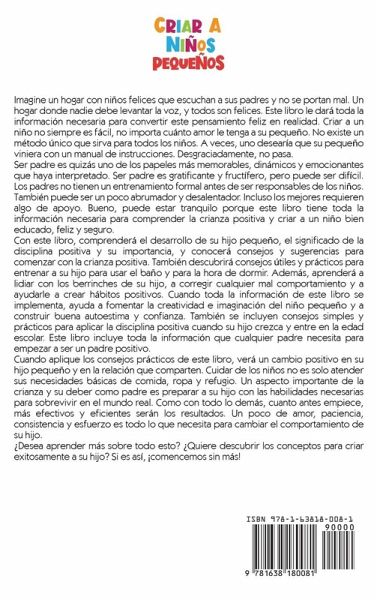 ¡Consiga llevar la crianza al siguiente nivel con disciplina positiva! ¿Duda de sus habilidades de crianza cada vez que su hijo hace un berrinche? ¿La hora de dormir se siente como una batalla imposible? ¿Quiere enseñar a su hijo a ir al baño sin problemas? ¿Le cuesta lidiar con los berrinches o el mal comportamiento de su hijo? ¿Quiere criar un niño feliz y seguro de sí mismo? ¿Quiere descubrir los secretos para lograr todo esto? Si es así, entonces este es el libro perfecto para usted. ¿Ha oído hablar de la crianza positiva? ¿Quiere aprender más al respecto? Incluso si no lo ha escuchado, no tiene de qué preocuparse porque Criar a niños pequeños: Una guía para usar la disciplina positiva y criar a niños con buena autoestima, con consejos para enseñarle a dormir solo, controlar los berrinches, y enseñarle a usar el baño, contiene toda la información necesaria. Darle la bienvenida a casa a un bebé y entrar en la paternidad es un hito importante en la vida. También es un cambio significativo. A partir de entonces, usted es responsable no solo de sí mismo, sino también del bienestar y el crecimiento de su hijo. Independientemente de cuánto ame a su pequeño, la paternidad viene con una serie de desafíos. Como todo en la vida, la preparación, la paciencia y el esfuerzo ayudan a enfrentar cualquier reto que se presente. Criar a un niño no siempre es fácil, y la disciplina suele ser un elemento difícil para muchos padres. Una cosa maravillosa de la crianza es que le da completo control sobre la regulación del comportamiento de su hijo. Cuando aprenda la forma correcta de disciplinar a su hijo, criar un niño bien educado se vuelve bastante fácil. La crianza positiva le proporciona todas las herramientas adecuadas que necesita para criar un niño feliz, seguro de sí mismo y bien educado. La crianza positiva es un concepto simple que se centra en la disciplina positiva. Recuerde, no hay niños malos; todo se reduce a los comportamientos. Con la crianza positiva, puede inculcar buenos comportamientos mientras le enseña a su hijo por qué el mal comportamiento no es deseable. En este libro, aprenderá sobre...Comprender el desarrollo de un niño pequeño Significado y beneficios de la disciplina positiva Los principios de la disciplina positiva Consejos prácticos para enseñar a su hijo a ir al baño y a dormir toda la noche Lidiar con los berrinches y el mal comportamiento Consejos para fomentar la creatividad Consejos para construir la autoestima de un niño pequeño Cómo criar a un niño seguro de sí mismo La importancia de los hábitos diarios positivos, y ¡mucho más! Este libro será su guía y proporcionará información útil sobre cómo criar a un niño pequeño utilizando la disciplina positiva. Le ayudará en cada paso del camino y mejorará sus habilidades como padre. ¡Adquiera este libro ahora para aprender más sobre la crianza de niños pequeños!