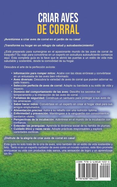 ¡Aventúrese a criar aves de corral en el jardín de su casa! ¡Transforme su hogar en un refugio de salud y autoabastecimiento! ¿Está preparado para sumergirse en el apasionante mundo de las aves de corral de traspatio? Su viaje para convertirse en un experto en avicultura autosuficiente comienza aquí. Esta completa guía es la llave que le abrirá las puertas a un estilo de vida más saludable y sostenible, desde la comodidad de su hogar.Descubra el arte de la perfección avícola:Información para romper mitos: Acabe con las ideas erróneas y conviértase en un entusiasta de las aves bien informado. Aves diversas: Descubra la variedad de aves de corral que pueden adornar su patio trasero. Selección perfecta de aves de corral: Adapte su bandada a su estilo de vida y espacio. Dominio del comportamiento de las aves: Descifre los secretos del temperamento y la interacción de las aves de corral. Fortaleza de seguridad: Construya un santuario para proteger a sus aves de las amenazas. Saber hacer nidos: Conviértase en un experto en crear el hogar ideal para sus amigos emplumados. Alimentación precisa: nutra a su rebaño con una nutrición óptima. Enfermedad y prevención: Manténgase a la vanguardia con conocimientos sanitarios vitales. Perspectivas de la incubación: Adéntrese en el mundo de la incubación con confianza. Entender las jerarquías: Aprenda la dinámica social de su familia de plumas. Cuidado ético y razas raras: Adopte prácticas responsables y explore variedades exóticas. ¡Disfrute de la alegría de criar aves de corral en casa! Esta guía no solo trata de la cría de aves, sino también de un estilo de vida sostenible y feliz. Tanto si es un experto cuidador de aves como un novato curioso, este libro promete enriquecer su vida con productos más sanos, una sensación de logro y un aprendizaje sin fin. ¡Su camino hacia la maestría avícola le espera! No espere más.