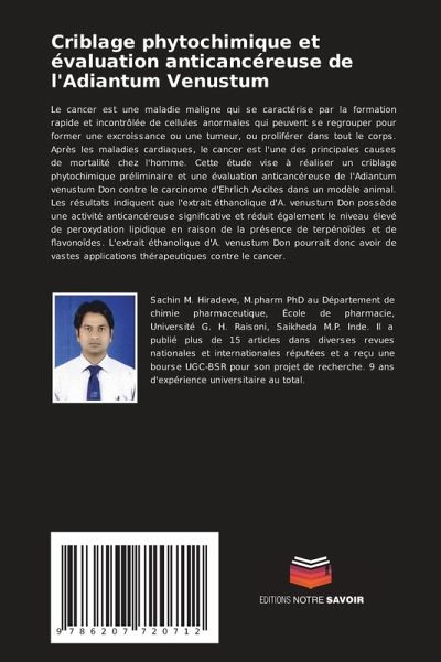 Le cancer est une maladie maligne qui se caractérise par la formation rapide et incontrôlée de cellules anormales qui peuvent se regrouper pour former une excroissance ou une tumeur, ou proliférer dans tout le corps. Après les maladies cardiaques, le cancer est l'une des principales causes de mortalité chez l'homme. Cette étude vise à réaliser un criblage phytochimique préliminaire et une évaluation anticancéreuse de l'Adiantum venustum Don contre le carcinome d'Ehrlich Ascites dans un modèle animal. Les résultats indiquent que l'extrait éthanolique d'A. venustum Don possède une activité anticancéreuse significative et réduit également le niveau élevé de peroxydation lipidique en raison de la présence de terpénoïdes et de flavonoïdes. L'extrait éthanolique d'A. venustum Don pourrait donc avoir de vastes applications thérapeutiques contre le cancer.