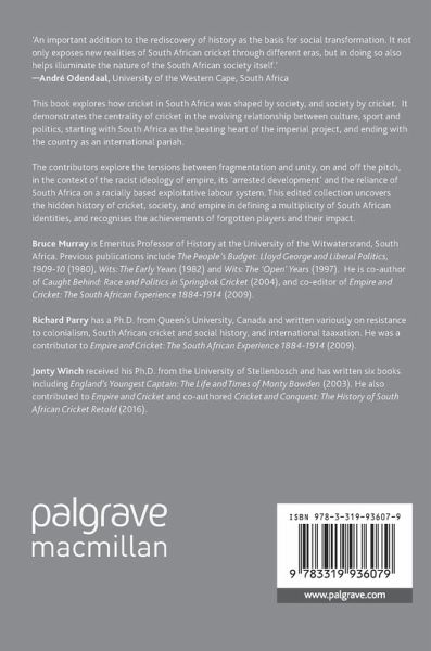 Foreword; Andre Odendaal.- PART I: THE LANDSCAPE.- 1. Introduction: Landscape, Players and Politics; Richard Parry, Jon Gemmell and Jonty Winch.- 2. Eclipse of the Summerbok: Percy Sherwell, Paul Roos and the Competition for a National Game for South Africa; Geoffrey Levett.- 3. 'Not the same thing as on grass': Cultural Pessimism and the Development of South African Cricket, Matting Wickets and the Migration to Turf, 1876-1935; Dale Slater.- PART II: THE PLAYERS.- 4. African Cricket on the Rand: Piet Gwele, Frank Roro and the Shaping of a Community; Richard Parry.- 5. Rhodes, Cricket and the Scholarship Legacy: A Southern African Perspective, 1903-1971; Jonty Winch.- 6. India in the Imagination of Indian South African Cricket, 1910-1971; Goolam Vahed.- 7. Diffusion and Depiction: How Afrikaners came to Play Cricket in Twentieth-Century South Africa; Albert Grundlingh.- 8. The Education of Bruce Mitchell and the 'Union Babies': History, Accumulation and the Path to Triumph at Lord's, 1924-1935 Richard Parry and Dale Slater.- 9. 'Rejects of the Sporting Whites of the Continent': African Cricket in Rhodesia; Jonty Winch.- PART III: THE POLITICS.- 10. Should the West Indies have Toured South Africa in 1959? C.L.R. James versus Learie Constantine; Jonty Winch.- 11. The D'Oliveira Affair: The End of an Era; Bruce Murray.- 12. 'Who are we ... to tell the South Africans how to run their country?' The Women's Cricket Association and the Aftermath of the D'Oliveira Affair, 1968-9; Rafaelle Nicholson.- 13. The Newlands 'Walk-off''; Patrick Ferriday.- Index.
