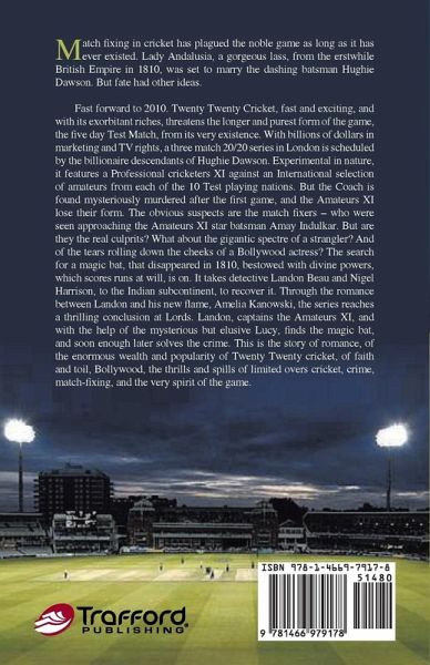 Match fixing in cricket has plagued the noble game as long as it has ever existed. Lady Andalusia, a gorgeous lass, from the erstwhile British Empire in 1810, was set to marry the dashing batsman Hughie Dawson. But fate had other ideas. Fast forward to 2010. Twenty Twenty Cricket, fast and exciting, and with its exorbitant riches, threatens the longer and purest form of the game, the five day Test Match, from its very existence. With billions of dollars in marketing and TV rights, a three match 20/20 series in London is scheduled by the billionaire descendants of Hughie Dawson. Experimental in nature, it features a Professional cricketers XI against an International selection of amateurs from each of the 10 Test playing nations. But the Coach is found mysteriously murdered after the first game, and the Amateurs XI lose their form. The obvious suspects are the match fixers - who were seen approaching the Amateurs XI star batsman Amay Indulkar. But are they the real culprits? What about the gigantic spectre of a strangler? And of the tears rolling down the cheeks of a Bollywood actress? The search for a magic bat, that disappeared in 1810, bestowed with divine powers, which scores runs at will, is on. It takes detective Landon Beau and Nigel Harrison, to the Indian subcontinent, to recover it. Through the romance between Landon and his new flame, Amelia Kanowski, the series reaches a thrilling conclusion at Lords. Landon, captains the Amateurs XI, and with the help of the mysterious but elusive Lucy, finds the magic bat, and soon enough later solves the crime. This is the story of romance, of the enormous wealth and popularity of Twenty Twenty cricket, of faith and toil, Bollywood, the thrills and spills of limited overs cricket, crime, match-fixing, and the very spirit of the game.
