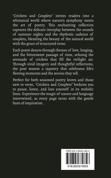 "Crickets and Couplets" invites readers into a whimsical world where nature's symphony meets the art of poetry. This enchanting collection captures the delicate interplay between the sounds of summer nights and the rhythmic cadence of couplets, blending the beauty of the natural world with the grace of structured verse. Each poem dances through themes of love, longing, and the bittersweet passage of time, echoing the serenade of crickets that fill the twilight air. Through vivid imagery and thoughtful reflections, the poet weaves a tapestry that celebrates life's fleeting moments and the stories they tell. Perfect for both seasoned poetry lovers and those new to verse, "Crickets and Couplets" beckons you to pause, listen, and lose yourself in its melodic lines. Experience the magic of nature and language intertwined, as every page turns with the gentle hum of inspiration.