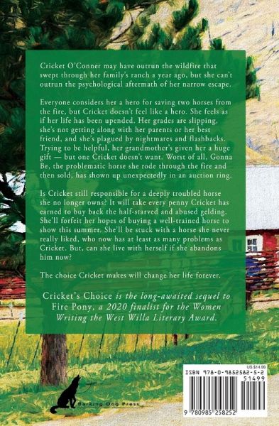 Cricket O'Conner may have outrun the wildfire that swept through her family's ranch a year ago, but she can't outrun the psychological aftermath of her narrow escape. Everyone considers her a hero for saving two horses from the fire, but Cricket doesn't feel like a hero. She feels as if her life has been upended. Her grades are slipping, she's not getting along with her parents or her best friend, and she's plagued by nightmares and flashbacks. Trying to be helpful, her grandmother's given her a huge gift - but one Cricket doesn't want. Worst of all, Gonna Be, the problematic horse she rode through the fire and then sold, has shown up unexpectedly in an auction ring. Is Cricket still responsible for a deeply troubled horse she no longer owns? It will take every penny Cricket has earned to buy back the half-starved and abused gelding. She'll forfeit her hopes of buying a well-trained horse to show this summer. She'll be stuck with a horse she never really liked, who now has at least as many problems as Cricket. But, can she live with herself if she abandons him now? The choice Cricket makes will change her life forever. Cricket's Choice is the long-awaited sequel to Fire Pony, a Women Writing the West 2020 Willa Literary Award finalist.