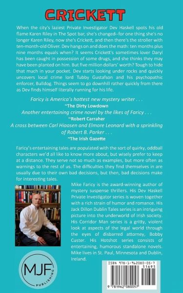 Crickett is the EIGHTH mystery in the highly entertaining Dev Haskell Private Investigator mystery series. Mike Faricy once again proves himself to be Minnesota's Master of the Bizarre. When the city's laziest Private Investigator Dev Haskell spots his old flame Karen Riley in The Spot bar, she's changed--for one thing she's no longer Karen Riley, now she's Crickett, and then there's the stroller with ten month old Oliver. Dev hangs on and does the math: ten months plus nine months equals when? It seems Crickett's sometime lover Daryl has been caught in possession of some drugs, and she thinks they may have been planted on him. But five million dollars worth? Tough to hide that much in your pocket. Dev starts looking under rocks and quickly uncovers local crime lord Tubby Gustafson and his psychopathic enforcer, Bulldog. Things seem to go downhill rather quickly from there as Dev finds himself literally running for his life. Crickett is a hilariously entertaining hard-boiled mystery, with just enough chills to keep you on the edge of your seat. A delightful read with a heavy dose of corner cutting and misbehavior to go with the beverage of your choice. "Faricy is the next Carl Hiaasen." -Crime Scene "Faricy is America's hottest new mystery writer ... and Dev Haskell is one of the looniest and most enjoyable characters inhabiting the world of fictional PIs out there today." -The Dirty Lowdown