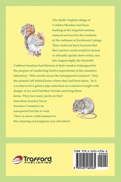 The idyllic English village of Crickley Meadow had been basking in the heat of the long, hot summer, enjoyed not least by the thirty residents of the outhouse at Fernbrook Cottage. They could not have envisaged their perfect world being turned so abruptly upside-down as it was when the dastardly Cuthbert Fanshaw had thirteen of their number kidnapped. Fanshaw Cosmetics had been struggling to develop new products following a successful campaign to stop animal testing in its laboratory and now Fanshaw planned to conduct his experiments in secret. Who would rescue the beleaguered creatures? Only the animals left behind knew where they had been taken. So it was that twelve guinea pigs embarked on hazardous mission to find their friends and bring them home. They face many perils on the journey over land and through the town of Whitebridge, yet at Fanshaw Cosmetics, still more trouble lies in wait. Confronted by an enemy of their own size, the guinea pigs will need to outwit and defeat this new foe if they are to rescue their friends and not end up as captives themselves. Even if they can succeed, they will then have to tackle the not inconsiderable task of escaping the confines of Fanshaw Cosmetics and making it home again in one piece!