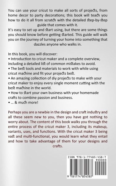 You can use your cricut to make all sorts of projects, from home decor to party decorations; this book will teach you how to do it all from scratch with the detailed step-by-step guide that comes with it. It's easy to set up and start using, but there are some things you should know before getting started. This guide will walk you on the journey of turning your home into something that dazzles anyone who walks in. In this book, you will discover:Introduction to cricut maker and a complete overview, including a detailed list of common mistakes to avoid. The best tools and materials to work with while using cricut machine and fit your projects best. An amazing collection of diy projects to make with your cricut maker to enjoy every single moment cutting with the best machine in the world. How to start your own business with your homemade crafts to combine passion and business. ... & much more! Perhaps you are a newbie in the design and craft industry and all these seem new to you, then you have got nothing to worry about. The content of this book walks you through the entire process of the cricut maker 3, including its makeup, variants, uses, and functions. With the cricut maker 3 being vast and multi-functional, you would learn what they entail and how to take advantage of them for your designs and crafts.