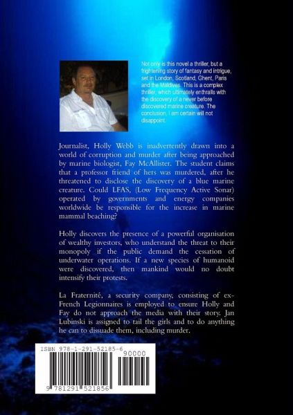 Journalist, Holly Webb is inadvertently drawn into a world of corruption and murder after being approached by marine biologist, Fay McAllister. The student claims that a professor friend of hers was murdered, after threatening to disclose the discovery of a blue marine creature. Could LFAS, (Low Frequency Active Sonar) operated by governments and energy companies worldwide be responsible for the increase in marine mammal beaching? Holly discovers the presence of a powerful organisation of wealthy investors, who understand the threat to their monopoly if the public demand the cessation of underwater operations. If a new species of humanoid were discovered, then mankind would no doubt intensify their protests. La Fraternité, a security company, consisting of ex-French Legionnaires is employed to ensure Holly and Fay do not approach the media with their story. Jan Lubinski is assigned to tail the girls and to do anything he can to dissuade them, including murder. The conclusion will not disappoint.