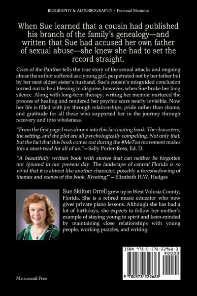 Youngest sister of three and older sister of one brother, author Sue Skilton Orrell felt her parents' admonition to "act mature" as a restraint against normal childhood feelings. She wished she could cry out like the Florida panthers that circulated on her family's rural property, but obeying the admonition prevented her from doing so. This default setting of denial intensified tragically within the more generalized culture of silence when she hit adolescence. When Orrell was raped twice as a young teenager, she found no immediate supporters-except herself. Orrell channeled her stubbornness into getting a good education, even though the academic challenge almost gave way to the weight of shame, depression, and false guilt. Now, she has taken on the strength of the panther with renewed spirit, bursting creativity, and power of voice clearly audible, no longer afraid to cry. Cries of the Panther on Mockingbird Hill is for anyone affected by sexual abuse, either directly or indirectly. May the voice of all survivors of any type of abuse be heard by sympathetic ears, and may those who hear have courage to act.