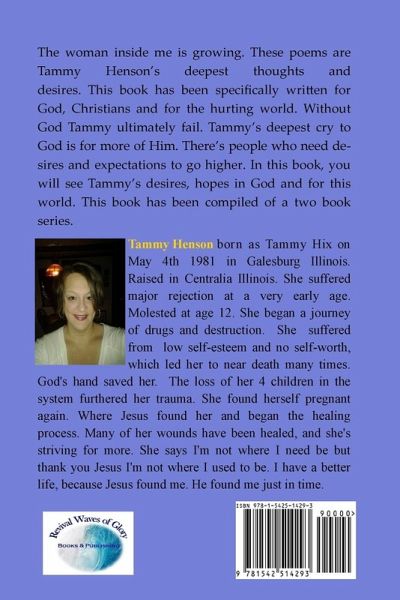 The woman inside me is growing. These poems are Tammy Henson's deepest thoughts and desires. This book has been specifically written for God, Christians and for the hurting world. Without God Tammy ultimately fail. Tammy's deepest cry to God is for more of Him. There's people who need desires and expectations to go higher. In this book, you will see Tammy's desires, hopes in God and for this world. This book has been compiled of a two book series.