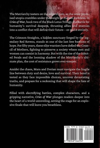 The Matriarchy teeters on the edge of ruin, as the once-promised utopia crumbles under the weight of its own darkness. In Cries of War, book two of the Black Lotus Trilogy, the battle for humanity's survival deepens, thrusting allies and enemies into a conflict that will define their future-or end it entirely. The Crimson Straights, a hidden sanctuary forged by the legendary Red Ravens, stands as one of the last free bastions of hope. For fifty years, these elite warriors have defied the Council of Mothers, fighting to preserve a society where men and women can coexist in harmony. But with the rise of the infected Ferals and the looming shadow of the Matriarchy's ultimate plan, the cost of resistance grows ever steeper. Amidst the chaos, Mara and Dorian must navigate the fragile line between duty and desire, love and survival. Their bond is tested as they face impossible choices, uncover devastating truths, and prepare for a reckoning that will shape the fate of humanity. Filled with electrifying battles, complex characters, and a gripping narrative, Cries of War plunges readers deeper into the heart of a world unraveling, setting the stage for an explosive finale that will leave you breathless.