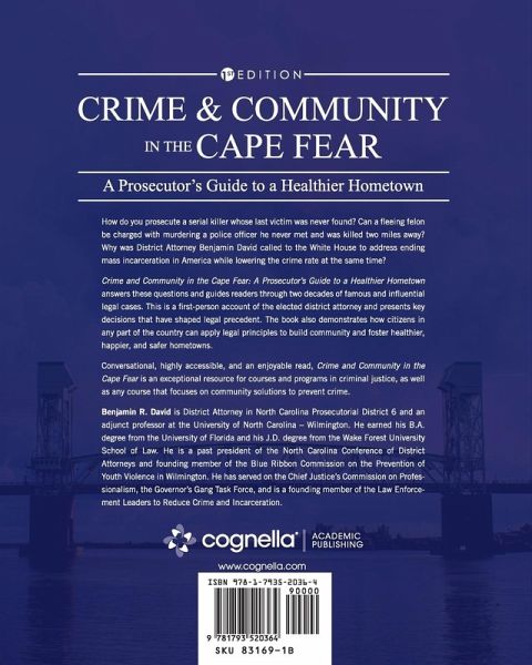 How do you prosecute a serial killer whose last victim was never found? Can a fleeing felon be charged with murdering a police officer he never met and was killed two miles away? Why was District Attorney Benjamin David called to the White House to address ending mass incarceration in America while lowering the crime rate at the same time? Crime and Community in the Cape Fear: A Prosecutor's Guide to a Healthier Hometown answers these questions and guides readers through two decades of famous and influential legal cases. This is a first-person account of the elected district attorney and presents key decisions that have shaped legal precedent. The book also demonstrates how citizens in any part of the country can apply legal principles to build community and foster healthier, happier, and safer hometowns. Conversational, highly accessible, and an enjoyable read, Crime and Community in the Cape Fear is an exceptional resource for courses and programs in criminal justice, as well as any course that focuses on community solutions to prevent crime.