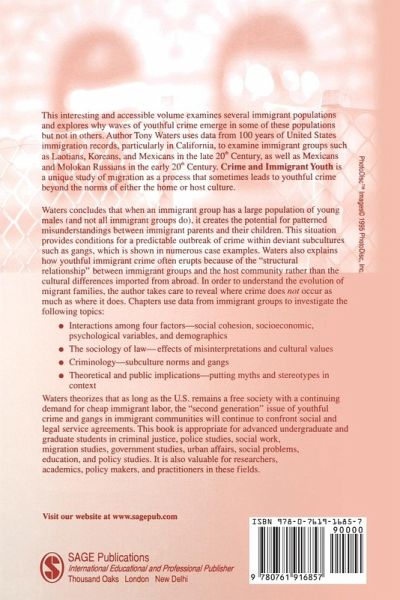 Crime and Immigrant Youth is a unique study of migration as a process that sometimes leads to youthful crime beyond the norms of either the home or host culture. Tony Waters uses data from 100 years of United States immigration records to examine immigrant groups such as Laotians, Koreans and Mexicans in the late 20th century, as well as Mexicans and Molkan Russians in the early years of the century. The study reveals the sequential consequences of a high proportion of young males in an immigrant group: patterned misunderstanding between parents and children; deviant subcultures such as gangs; structural rather than cultural differences with the host community. Tony Waters also devotes a large part of this study to show where and why crime does not develop on account of a large presence of immigrant youth.