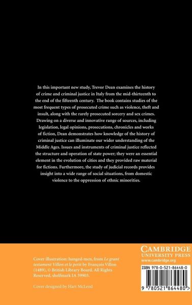 In this important new study, Trevor Dean examines the history of crime and criminal justice in Italy from the mid-thirteenth to the end of the fifteenth century. The book contains studies of the most frequent types of prosecuted crime such as violence, theft and insult, along with the rarely prosecuted sorcery and sex crimes. Drawing on a diverse and innovative range of sources, including legislation, legal opinions, prosecutions, chronicles and works of fiction, Dean demonstrates how knowledge of the history of criminal justice can illuminate our wider understanding of the Middle Ages. Issues and instruments of criminal justice reflected the structure and operation of state power; they were an essential element in the evolution of cities and they provided raw material for fictions. Furthermore, the study of judicial records provides insight into a wide range of social situations, from domestic violence to the oppression of ethnic minorities.