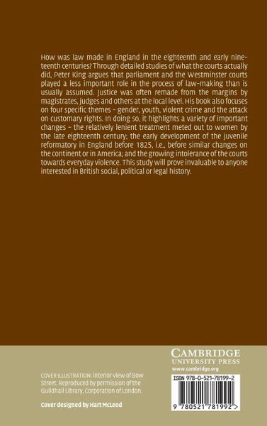 How was law made in England in the eighteenth and early nineteenth centuries? Through detailed studies of what the courts actually did, Peter King argues that parliament and the Westminster courts played a less important role in the process of law making than is usually assumed. Justice was often remade from the margins by magistrates, judges and others at the local level. His book also focuses on four specific themes - gender, youth, violent crime and the attack on customary rights. In doing so it highlights a variety of important changes - the relatively lenient treatment meted out to women by the late eighteenth century, the early development of the juvenile reformatory in England before 1825, i.e. before similar changes on the continent or in America, and the growing intolerance of the courts towards everyday violence. This study is invaluable reading to anyone interested in British political and legal history.
