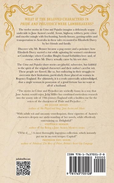 What if the beloved characters in Pride and Prejudice were lawbreakers? The twelve stories in Crime and Prejudice imagine a deliciously seamy underside to Jane Austen's world. Arson, highway robbery, petty crime and murder mingle with fox-hunting, bawdy-houses, gaming-tables and transportation to Australia in these tales recounted to Elizabeth Darcy by her friends and family. Discover why Mr. Bennet became a pug owner and a poisoner; how Elizabeth Darcy started a riot while agitating for women's enrolment at Cambridge; where Caroline Bingley found forbidden love; and, of course, when Mr. Darcy actually came by his wet shirt. The Crime and Prejudice short stories are playful, subversive, but faithful to the spirit of the original characters and their author's acerbic wit. These people are flawed, like us, but endearing in their struggles to overcome their limitations, particularly those placed on women in Regency England. For ultimately, it is a truth universally acknowledged, that a single woman in possession of a good fortune has no want at all of a husband. If you like Richard Osman and Alexander McCall Smith, and love Jane Austen, Crime and Prejudice is for you!