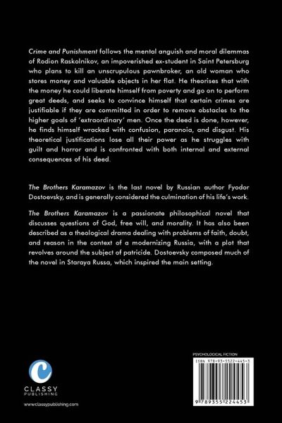 Crime and Punishment follows the mental anguish and moral dilemmas of Rodion Raskolnikov, an impoverished ex-student in Saint Petersburg who plans to kill an unscrupulous pawnbroker, an old woman who stores money and valuable objects in her flat. He theorises that with the money he could liberate himself from poverty and go on to perform great deeds, and seeks to convince himself that certain crimes are justifiable if they are committed in order to remove obstacles to the higher goals of 'extraordinary' men. Once the deed is done, however, he finds himself wracked with confusion, paranoia, and disgust. His theoretical justifications lose all their power as he struggles with guilt and horror and is confronted with both internal and external consequences of his deed. The Brothers Karamazov is the last novel by Russian author Fyodor Dostoevsky, and is generally considered the culmination of his life's work. The Brothers Karamazov is a passionate philosophical novel that discusses questions of God, free will, and morality. It has also been described as a theological drama dealing with problems of faith, doubt, and reason in the context of a modernizing Russia, with a plot that revolves around the subject of patricide. Dostoevsky composed much of the novel in Staraya Russa, which inspired the main setting.