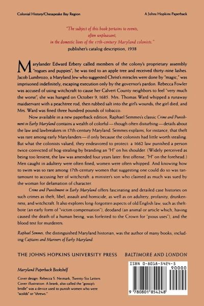 "The subject of this book pertains to events, often unpleasant, in the domestic lives of the 17th-century Maryland colonists."--publisher's catalog description, 1938 Marylander Edward Erbery called members of the colony's proprietary assembly "rogues and puppies"; he was tied to an apple tree and received thirty-nine lashes. Jacob Lumbrozo, a Maryland Jew who suggested Christ's miracles were done by "magic," was imprisoned indefinitely, escaping execution only by the governor's pardon. Rebecca Fowler was accused of using witchcraft to cause her Calvert County neighbors to feel "very much the worse;" she was hanged on October 9, 1685. Mrs. Thomas Ward whipped a runaway maidservant with a peachtree rod, then rubbed salt into the girl's wounds; the girl died, and Mrs. Ward was fined three hundred pounds of tobacco. Now available in a new paperback edition, Raphael Semmes's classic Crime and Punishment in Colonial Maryland contains a wealth of colorful--though often disturbing--details about the law and lawbreakers in 17th-century Maryland. Semmes explains, for instance, that theft was rare among early Marylanders--if only because the colonists had little worth stealing. But what the colonists valued, they endeavored to protect: A 1662 law punished a person twice-convicted of hog-stealing by branding an "H" on his shoulder. (Widely perceived as being too lenient, the law was amended four years later: first offense, "H" on the forehead.) Men caught in adultery were often fined; women were often whipped. And knowing how to swim was so rare among 17th-century women that suggesting one could do so was tantamount to accusing her of witchcraft: a minister's son who claimed as much was sued by the woman for defamation of character. Crime and Punishment in Colonial Maryland offers fascinating and detailed case histories on such crimes as theft, libel, assault and homicide, as well as on adultery, profanity, drunkenness, and witchcraft. It also explores long-forgotten aspects of old English law, such as theftbote (an early form of "victim compensation"), deodand (an animal or article which, having caused the death of a human being, was forfeited to the Crown for "pious uses"), and the blood test for murderers.