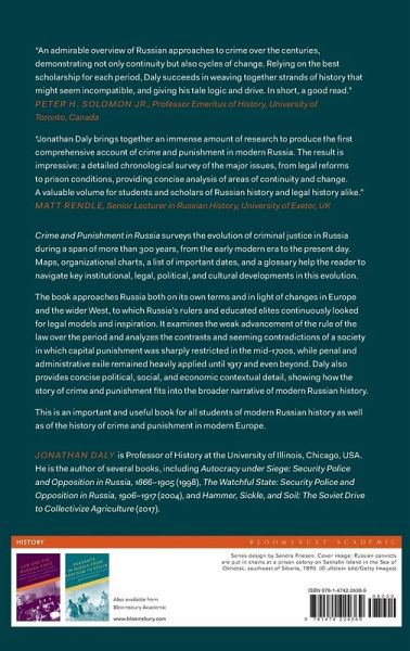 Crime and Punishment in Russia surveys the evolution of criminal justice in Russia during a span of more than 300 years, from the early modern era to the present day. Maps, organizational charts, a list of important dates, and a glossary help the reader to navigate key institutional, legal, political, and cultural developments in this evolution. The book approaches Russia both on its own terms and in light of changes in Europe and the wider West, to which Russia's rulers and educated elites continuously looked for legal models and inspiration. It examines the weak advancement of the rule of the law over the period and analyzes the contrasts and seeming contradictions of a society in which capital punishment was sharply restricted in the mid-1700s, while penal and administrative exile remained heavily applied until 1917 and even beyond. Daly also provides concise political, social, and economic contextual detail, showing how the story of crime and punishment fits into the broader narrative of modern Russian history. This is an important and useful book for all students of modern Russian history as well as of the history of crime and punishment in modern Europe.