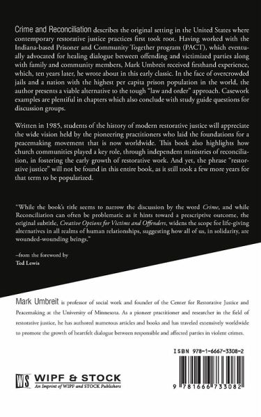 Crime and Reconciliation describes the original setting in the United States where contemporary restorative justice practices first took root. Having worked with the Indiana-based Prisoner and Community Together program (PACT), which eventually advocated for healing dialogue between offending and victimized parties along with family and community members, Mark Umbreit received firsthand experience, which, ten years later, he wrote about in this early classic. In the face of overcrowded jails and a nation with the highest per capita prison population in the world, the author presents a viable alternative to the tough ""law and order"" approach. Casework examples are plentiful in chapters which also conclude with study guide questions for discussion groups. Written in 1985, students of the history of modern restorative justice will appreciate the wide vision held by the pioneering practitioners who laid the foundations for a peacemaking movement that is now worldwide. This book also highlights how church communities played a key role, through independent ministries of reconciliation, in fostering the early growth of restorative work. And yet, the phrase ""restorative justice"" will not be found in this entire book, as it still took a few more years for that term to be popularized.
