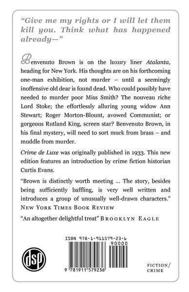 "Give me my rights or I will let them kill you. Think what has happened already—" Benvenuto Brown is on the luxury liner Atalanta, heading for New York. His thoughts are on his forthcoming one-man exhibition, not murder – until a seemingly inoffensive old dear is found dead. Who could possibly have needed to murder poor Miss Smith? The nouveau riche Lord Stoke; the effortlessly alluring young widow Ann Stewart; Roger Morton-Blount, avowed Communist; or gorgeous Rutland King, screen star? Benvenuto Brown, in his final mystery, will need to sort muck from brass – and muddle from murder. Crime de Luxe was originally published in 1933. This new edition features an introduction by crime fiction historian Curtis Evans. "Brown is distinctly worth meeting … The story, besides being sufficiently baffling, is very well written and introduces a group of unusually well-drawn characters." New York Times Book Review "An altogether delightful treat" Brooklyn Eagle