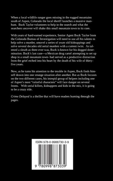 When a local wildlife ranger goes missing in the rugged mountains south of Aspen, Colorado the local sheriff launches a massive manhunt. Buck Taylor volunteers to help in the search and what the searchers uncover will shake this small mountain town to its core. With years of hard-earned experience, Senior Agent Buck Taylor from the Colorado Bureau of Investigation will need to use all his talents to help solve a murder, unravel a series of years old kidnappings and solve several, decades-old serial murders with a current twist. As talented a sleuth as there ever was, Buck is known for his dogged determination. Buck's last case-a Mexican drug cartel attempting to set up shop in a small mountain town- had served as a productive distraction from the grief etched into his heart by the death of his wife of thirty-five years. Now, as he turns his attention to the trouble in Aspen, Buck finds himself drawn into one strange situation after another. But as Buck focuses on the two different cases, his intrepid group of helpers including one of Aspen's most "colorful characters" will face danger on several fronts. With serial killers, kidnappers and kids in the mix, it is going to be a crazy ride. Crime Delayed is a thriller that will have readers burning through the pages.