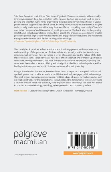 'Matthew Bowden's book Crime, Disorder and Symbolic Violence represents a theoretically innovative, research-based contribution to the nascent body of sociological work on plural policing and the often hybrid forms of governing the urban periphery and in particular of young people in these supposed 'neo-liberal' times. Drawing on both Bourdieuian theoretical insights and a broadly realist conceptual framing, Bowden offers a compelling case study of Dublin's own 'urban periphery' and its contested youth governance. The book adds to the growing reputation of critical criminological scholarship in Ireland. The analysis presented and its broader policy and policy implications will also interest and engage advanced students and researchers throughout the international field of sociological criminology.' - Professor Gordon Hughes, Chair in Criminology, Cardiff University