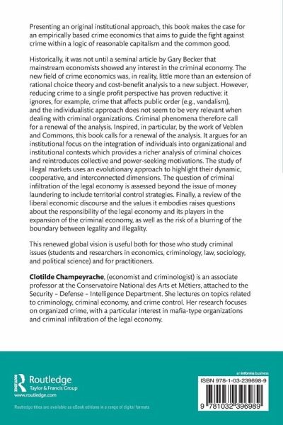 Historically, it was not until a seminal article by Gary Becker that mainstream economists showed any interest in the criminal economy. The new field of crime economics was, in reality, little more than an extension of rational choice theory and cost-benefit analysis to a new subject. However, reducing crime to a single profit perspective has proven reductive: it ignores, for example, crime that affects public order (e.g., vandalism), and the individualistic approach does not seem to be very relevant when dealing with criminal organizations. Criminal phenomena therefore call for a renewal of the analysis. Inspired, in particular, by the work of Veblen and Commons, this book calls for a renewal of the analysis. It argues for an institutional focus on the integration of individuals into organizational and institutional contexts which provides a richer analysis of criminal choices and reintroduces collective and power-seeking motivations. The study of illegal markets uses an evolutionary approach to highlight their dynamic, cooperative, and interconnected dimensions. The question of criminal infiltration of the legal economy is assessed beyond the issue of money laundering to include territorial control strategies. Finally, a review of the liberal economic discourse and the values it embodies raises questions about the responsibility of the legal economy and its players in the expansion of the criminal economy, as well as the risk of a blurring of the boundary between legality and illegality.