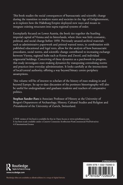 Exemplarily focused on Lower Austria, the book ties together the bustling imperial capital of Vienna and its hinterlands, where there was little economic, political, and social change before 1850. Previously unused archival materials such as administrative paperwork and printed wanted notes, in combination with published educational and legal texts, allow for the analysis of how bureaucratic procedures, social norms, and scientific change contributed to increasing exchange between Vienna, regional hubs such as Krems and Zwettl, and individual seigneurial holdings. Conceiving of these dynamics as a patchwork-in-progress, this study investigates state-making dynamics by transposing centralising norms and practices into everyday administration. It looks carefully at the intersections of local/central authority, offering a way beyond binary centre-periphery assumptions.