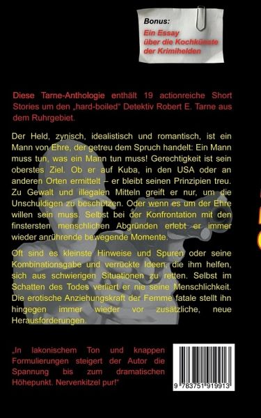 Die Anthologie enthält 19 actionreiche Short Stories um den "hard-boiled" Detektiv Robert E. Tarne aus dem Ruhrgebiet.Der Held, zynisch, idealistisch und romantisch, ist ein Mann von Ehre, der getreu dem Spruch handelt: Ein Mann muss tun, was ein Mann tun muss! Gerechtigkeit ist sein oberstes Ziel. Ob er auf Kuba, in den USA oder an anderen Orten ermittelt - er bleibt seinen Prinzipien treu. Zu Gewalt und illegalen Mitteln greift er nur, um die Unschuldigen zu beschützen. Oder wenn es um der Ehre willen sein muss. Selbst bei der Konfrontation mit den finstersten menschlichen Abgründen erlebt er immer wieder anrührende bewegende Momente. Oft sind es kleinste Hinweise und Spuren oder seine Kombinationsgabe und verrückte Ideen, die ihm helfen, sich aus schwierigen Situationen zu retten. Selbst im Schatten des Todes verliert er nie seine Menschlichkeit. Die erotische Anziehungskraft der Femme fatale stellt ihn hingegen immer wieder vor zusätzliche, neue Herausforderungen.In lakonischem Ton und knappen Formulierungen steigert der Autor die Spannung bis zum dramatischen Höhepunkt. Nervenkitzel pur!