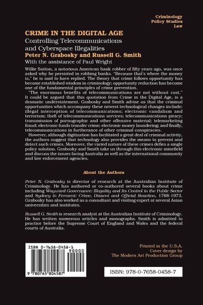 Willie Sutton, a notorious American bank robber of fifty years ago, was once asked why he persisted in robbing banks. "Because that's where the money is," he is said to have replied. The theory that crime follows opportunity has become established wisdom in criminology; opportunity reduction has become one of the fundamental principles of crime prevention. "The enormous benefits of telecommunications are not without cost." It could be argued that this quotation from Crime in the Digital Age, is a dramatic understatement. Grabosky and Smith advise us that the criminal opportunities which accompany these newest technological changes include: illegal interception of telecommunications; electronic vandalism and terrorism; theft of telecommunications services; telecommunications piracy; transmission of pornographic and other offensive material; telemarketing fraud; electronic funds transfer crime; electronic money laundering; and finally, telecommunications in furtherance of other criminal conspiracies. However, although digitization has facilitated a great deal of criminal activity, the authors suggest that technology also provides the means to prevent and detect such crimes. Moreover, the varied nature of these crimes defies a single policy solution. Grabosky and Smith take us through this electronic minefield and discuss the issues facing Australia as well as the international community and law enforcement agencies.