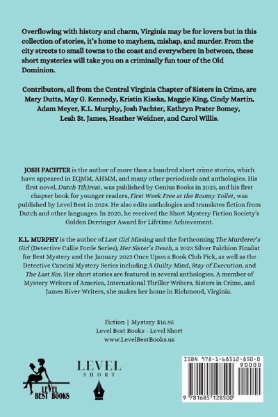 Overflowing with history and charm, Virginia may be for lovers but in this collection of stories, it's home to mayhem, mishap, and murder. From the city streets to small towns to the coast and everywhere in between, these short mysteries will take you on a criminally fun tour of the Old Dominion. Contributors, all from the Central Virginia Chapter of Sisters in Crime, are Mary Dutta, May G. Kennedy, Kristin Kisska, Maggie King, Cindy Martin, Adam Meyer, K.L. Murphy, Josh Pachter, Kathryn Prater Bomey, Leah St. James, Heather Weidner, and Carol Willis.
