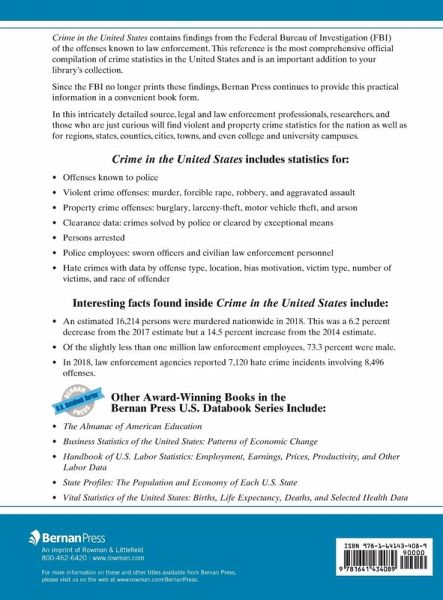 Crime in the United States contains findings from the Federal Bureau of Investigation (FBI) of the offenses known to law enforcement and released annually. This reference is the most comprehensive official compilation of crime statistics in the United States and is an important addition to your library's collection.Hinweis: Dieser Artikel kann nur an eine deutsche Lieferadresse ausgeliefert werden.