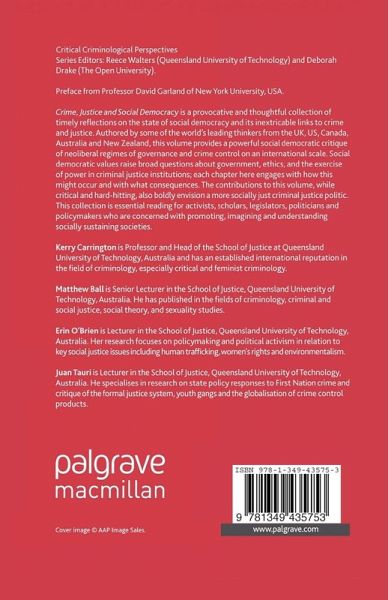 List of Tables and Figures Preface; D.Garland Notes on the Contributors List of Abbreviations Introducing New International Perspectives on Crime, Justice and Social Democracy; K.Carrington , M.Ball , E.O'Brien & J.Tauri PART I: SOCIAL JUSTICE, GOVERNANCE AND ETHICS The Sustaining Society; E.Currie Democracy and the Project of Liberal Inclusion: Values, Immigration and Criminal Justice; S.Karstedt Justice Matters: Australia's Social Inclusion Policy; J.Bessant PART II: PENAL POLICY AND PUNISHMENT IN THE GLOBAL ERA Penal Policy and the Social Democratic Image of Society; J.Pratt & A.Eriksson Imprisonment Rates, Social Democracy, Neo-liberalism and Justice Reinvestment; D.Brown PART III: THE LEGITIMACY OF CRIMINAL JUSTICE: CONTRADICTIONS BETWEEN SYSTEM, PRACTICES AND EXPERIENCES Penal Imaginaries: The Ironical Play of Rehabilitation within Crime, Justice and Democracy Discourses; P.Carlen Punishment and 'The People': Rescuing Populism From its Critics; R.Hogg Image Work(s): 'Simulated Policing' and the New Police (Popularity) Culture; M.Lee & A.McGovern Islamaphobia, Human Rights and the 'War on Terror': Labour's Record in Britain; S.Poynting PART IV: SEX, GENDER AND JUSTICE Sex Work, Sexual Exploitations and Consumerism; J.Phoenix Tactics of Antifeminist Backlash: The View from Advocates for Abused Women; M.Dragiewicz Understanding Woman Abuse in Canada: Past, Present, and Future; W.S.DeKeseredy Heteronormativity, Homonormativity, and Intimate Partner Violence in Non-Heterosexual and/or Non-Cisgendered Relationships: Some Unintended Consequences of Inclusive Discourses; M.Ball Social Change in the Australian Judiciary: Gender Diversity; S.R.Anleu & K.Mack PART V: INDIGENOUS JUSTICE An Indigenous Critique of Authoritarian Criminology; J.M.Tauri Reproducing Criminality: How Cure Can Enhance Cause; G.Cowlishaw Indigenous Women: Missing Subjects of Penal Discourse and Penal Politics; J.Stubbs Modes of Criminal Justice, IndigenousYouth and Social Democracy; C.Hearfield & J.Scott PART VI: ECO-JUSTICE AND ENVIRONMENTAL CRIME Eco Mafia and Environmental Crime; R.Walters Corporate Risk, Mining Camps and the Political Economy of Knowledge; K.Carrington PART VII: GLOBAL JUSTICE, TRANS-BORDER CRIME AND HUMAN RIGHTS Ideal Victims in Human Trafficking Awareness Campaigns; E.O'Brien State Crime and the Criminalisation of People-Smuggling: The Australian Experience; M.Grewcock Against Social Democracy: Mobility Rights for a Globalising World; L.Weber