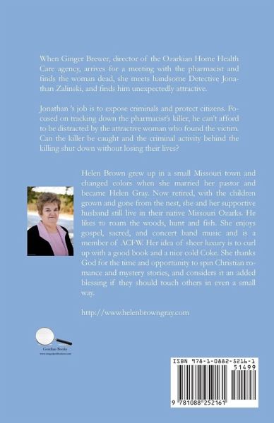 When Ginger Brewer, director of the Ozarkian Home Health Care agency, arrives for a meeting with the pharmacist and finds the woman dead, she meets handsome Detective Jonathan Zalinski, and finds him unexpectedly attractive. Jonathan 's job is to expose criminals and protect citizens. Focused on tracking down the pharmacist's killer, he can't afford to be distracted by the attractive woman who found the victim. Can the killer be caught and the criminal activity behind the killing shut down without losing their lives?