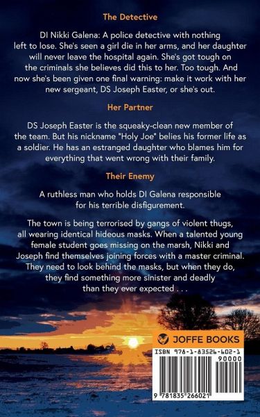 From multi-million-selling Joy Ellis, one of Britain's best-loved crime writers, with over twenty number-one bestsellers. Meet Detective Nikki Galena. She will stop at nothing to avenge her daughter. Under the brooding skies of the Lincolnshire Fens, she pursues the most vicious criminals. The Detective DI Nikki Galena: A police detective with nothing left to lose. She's seen a girl die in her arms, and her daughter will never leave the hospital again. She's got tough on the criminals she believes did this to her. Too tough. And now she's been given one final warning: make it work with her new sergeant, DS Joseph Easter, or she's out. Her Partner DS Joseph Easter is the squeaky-clean new member of the team. But his nickname "Holy Joe" belies his former life as a soldier. He has an estranged daughter who blames him for everything that went wrong with their family. Their Enemy A ruthless man who holds DI Galena responsible for his terrible disfigurement. The town is being terrorised by gangs of violent thugs, all wearing identical hideous masks. Then a talented young female student goes missing on the marsh and Nikki and Joseph find themselves joining forces with a master criminal in their efforts to save her. They need to look behind the masks, but when they do, they find something more sinister and deadly than they ever expected . . . The Setting The Lincolnshire Fens: great open skies brood over marshes, farmland, and nature reserves. It is not easy terrain for the Fenland Constabulary to police: with remote Fen villages, dangerous and often misty lanes, and poor telephone coverage. There are still villages where the oldest residents have never set foot outside their own farmland. A visit to the nearest town is a major event. But it has a strange airy beauty to it, and above it all are the biggest skies you've ever seen. This totally gripping mystery is perfect for fans of L.J. Ross, Angela Marsons, J.D. Kirk, Elly Griffiths and Ann Cleeves.