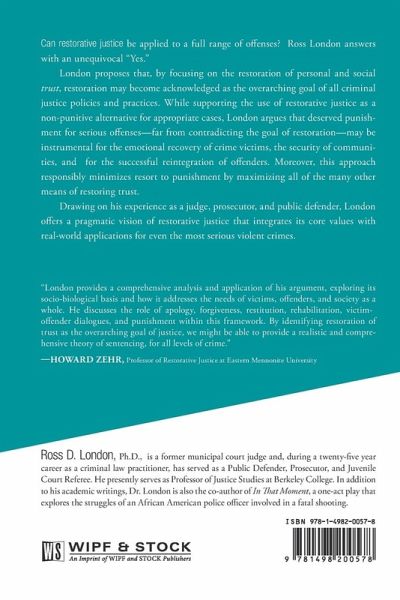 Can restorative justice be applied to a full range of offenses? Ross London answers with an unequivocal ""Yes."" London proposes that, by focusing on the restoration of personal and social trust, restoration may become acknowledged as the overarching goal of all criminal justice policies and practices. While supporting the use of restorative justice as a non-punitive alternative for appropriate cases, London argues that deserved punishment for serious offenses--far from contradicting the goal of restoration--may be instrumental for the emotional recovery of crime victims, the security of communities, and for the successful reintegration of offenders. Moreover, this approach responsibly minimizes resort to punishment by maximizing all of the many other means of restoring trust. Drawing on his experience as a judge, prosecutor, and public defender, London offers a pragmatic vision of restorative justice that integrates its core values with real-world applications for even the most serious violent crimes.