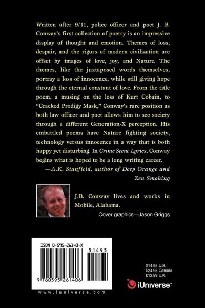 Written after 9/11, police officer and poet J. B. Conway's first collection of poetry is an impressive display of thought and emotion. Themes of loss, despair, and the rigors of modern civilization are offset by images of love, joy, and Nature. The themes, like the juxtaposed words themselves, portray a loss of innocence, while still giving hope through the eternal constant of love. From the title poem, a musing on the loss of Kurt Cobain, to "Cracked Prodigy Mask," Conway's rare position as both law officer and poet allows him to see society through a different Generation-X perception. His embattled poems have Nature fighting society, technology versus innocence in a way that is both happy yet disturbing. In