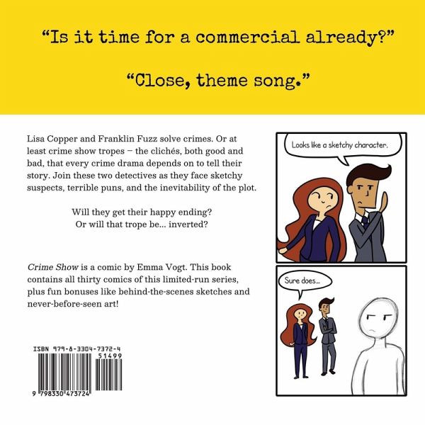 Lisa Copper and Franklin Fuzz solve crimes. Or at least crime show tropes - the clichés, both good and bad, that every crime drama depends on to tell their story. Join these two detectives in these cute comics as they face sketchy suspects, terrible puns, and the inevitability of the plot. Will they get their happy ending? Or will that trope be... inverted? Crime Show is a comic by Emma Vogt. This book contains all thirty comics of this limited-run webcomic series, plus fun bonuses like behind-the-scenes sketches and never-before-seen art!