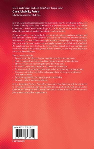 Research into the effects of crime solvability and detection outcomes.Studies ranging from less severe, high-volume crimes to severe offences.Effects of resources on investigating and detecting crime.Theoretical resourcing-solvability model of crime detection.Detection complements preventive approaches in containing criminal activity.Chapters on incident solvability and measured use of resources in different investigative stages.Predictive approaches for improving crime solvability.