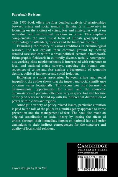 This 1986 book offered the first detailed analysis of relationships between crime and social trends in Britain. It is innovative in focusing on the victims of crime, fear and anxiety, as well as on individual and institutional reactions to crime - an emphasis that complements the more usual focus of British geography and criminology on offenders, offences and the built environment. Ethnographic fieldwork is combined with local and national victim surveys to highlight the human consequences of crime and fear against their social, economic and political background. Smith shows that variations in the incidence, impact and social significance of crime reflect the differential distribution of power within cities and regions. In accounting for the relationships between crime, anxiety and the quality of life in urban neighbourhoods, the book makes an interesting contribution to social theory. Amongst a variety of policy-related issues, particular attention is paid to the role of the police in a multi-agency approach to crime prevention and the management of fear.