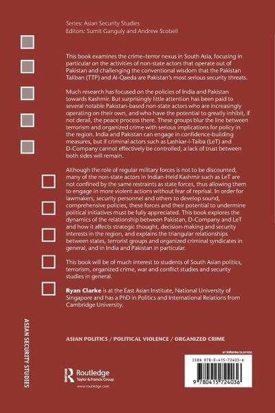 This book examines the crime-terror nexus in South Asia, focusing in particular on the activities of non-state actors that operate out of Pakistan, and challenges the conventional wisdom that the Pakistan Taleban (TTP) and Al-Qaeda are Pakistan's most serious security threats. Much research has focused on the policies of India and Pakistan towards Kashmir. But surprisingly little attention has been paid to several notable Pakistan-based non-state actors who are increasingly operating on their own, and who have the potential to greatly inhibit, if not derail, the peace process there. These groups blur the line between terrorism and organized crime with serious implications for policy in the region. India and Pakistan can engage in confidence-building measures, but if criminal actors such as Lashkar-i-Taiba (LeT) and D-Company cannot effectively be controlled, a lack of trust between both sides will remain. Although the role of regular military forces is not to be discounted, many of the non-state actors in Indian-Held Kashmir, such as LeT, are not confined by the same restraints as state forces, thus allowing them engage in more violent actions without fear of reprisal. In order for lawmakers, security personnel, and others to develop sound, comprehensive policies, these forces and their potential to undermine political initiatives must be fully appreciated. This book explores the dynamics of the relationship between Pakistan, D-Company, and LeT and how it affects strategic thought, decision-making, and security interests in the region and explains the triangular relationships between states, terrorist groups, and organized criminal syndicates in general, and in India and Pakistan in particular. This book will of much interest to students of South Asian politics, terrorism, organised crime, war and conflict studies, and Security Studies in general.