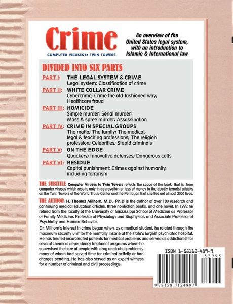 This book is an overview of the United States legal system, with a brief introduction to Islamic and International law. The book is divided into six parts. Part I (The Legal System and Crime) introduces the U.S. legal system and the classification of crime. Part II (White Collar Crime) covers cybercrime, crime the old fashioned way, and healthcare fraud. Part III (Homicide) deals with simple murder, serial murder, mass and spree murder; and assassination. Part IV (Special Groups) covers the mafia; the family; the medical, legal, and teaching professions; the religion profession; celebrities; and stupid criminals. Part V (On the Edge) deals with topics I consider to be a bit strange; that is, quackery, innovative defenses, and dangerous cults. And finally, Part VI (Residue) discusses what is left ... capital punishment and crimes against humanity, including terrorism. Throughout the book, to illustrate points, I have used over 300 cases of actual crimes. The names of the people and the facts of the cases used in the discussions of these crimes are taken directly from referenced news reports. The subtitle, Computer Viruses to Twin Towers, reflects the scope of the book; that is, from computer viruses, which cause only aggravation or loss of money, to the deadly terrorist attacks on the Twin Towers of the World Trade Center and the Pentagon on September 11, 2001 that snuffed out almost 3000 lives.