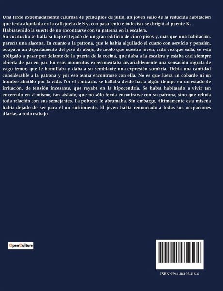 Una tarde extremadamente calurosa de principios de julio, un joven salió de la reducida habitación que tenía alquilada en la callejuela de S y, con paso lento e indeciso, se dirigió al puente K. Había tenido la suerte de no encontrarse con su patrona en la escalera. Su cuartucho se hallaba bajo el tejado de un gran edificio de cinco pisos y, más que una habitación, parecía una alacena. En cuanto a la patrona, que le había alquilado el cuarto con servicio y pensión, ocupaba un departamento del piso de abajo; de modo que nuestro joven, cada vez que salía, se veía obligado a pasar por delante de la puerta de la cocina, que daba a la escalera y estaba casi siempre abierta de par en par. En esos momentos experimentaba invariablemente una sensación ingrata de vago temor, que le humillaba y daba a su semblante una expresión sombría. Debía una cantidad considerable a la patrona y por eso temía encontrarse con ella. No es que fuera un cobarde ni un hombre abatido por la vida. Por el contrario, se hallaba desde hacía algún tiempo en un estado de irritación, de tensión incesante, que rayaba en la hipocondría. Se había habituado a vivir tan encerrado en sí mismo, tan aislado, que no sólo temía encontrarse con su patrona, sino que rehuía toda relación con sus semejantes. La pobreza le abrumaba. Sin embargo, últimamente esta miseria había dejado de ser para él un sufrimiento. El joven había renunciado a todas sus ocupaciones diarias, a todo trabajo