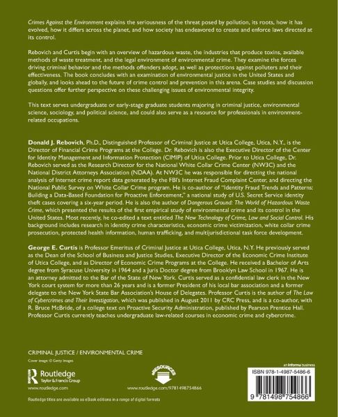 The book, from the perspective of law and criminology, centers on environmental crime, its commission, the types of entities that commit it, the laws enacted to prohibit it, how it is committed and effective means to control and prevent it.