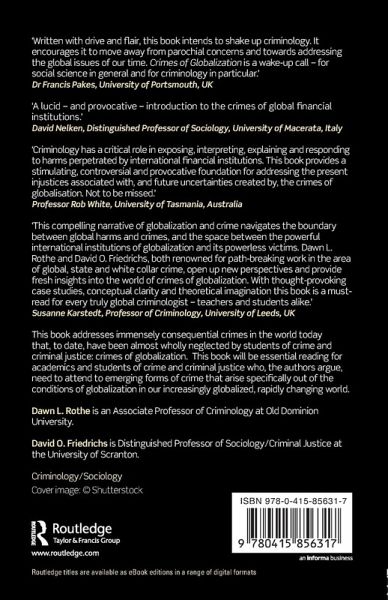 Dawn L. Rothe is an Associate Professor of Criminology at Old Dominion University. She is the author or co-author of six books, over six dozen peer-reviewed articles and book chapters dealing with related topics to crimes of globalization including state-corporate crime, state crime, and the international criminal justice system. Her articles appear in such journals as International Criminal Review, Contemporary Justice, Criminology and Public Policy, Justice Quarterly, Crime, Law and Social Change, and Social Justice as well as in various books. She has been a visiting professor and/or guest lecturer at a number of Universities in Croatia, South Africa, the United Kingdom, and Belgium. In 2008, she received the Critical Criminologists of the Year Award of the Division on Critical Criminology of the American Society of Criminology and in 2010 she was the recipient of the White-Collar Crime Research Consortium Young Scholar of the Year award. David O. Friedrichs is Distinguished Professor of Sociology/Criminal Justice at the University of Scranton. He has published several books as well over 130 book chapters, articles, encyclopaedia entries, proceedings papers, and essays on topics such as the legitimation of legal order, radical criminology, victimology, violence, narrative jurisprudence, postmodernism, and white collar crime. His articles have been published in such journals as Criminology, Justice Quarterly, Crime & Delinquency, Criminal Justice Review, Criminology & Public Policy, Social Research, Social Problems, Qualitative Sociology, Journal of Legal Education, and Teaching Sociology.. He has been a visiting professor or guest lecturer at a number of colleges and Universities, in Europe, South Africa, Israel and Australia, as well as in the United States. In 2005 he received the Lifetime Achievement Award of the Division on Critical Criminology of the American Society of Criminology. He served as President of the White Collar Crime Research Consortium.