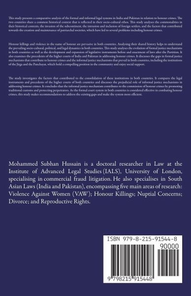 This study presents a comparative analysis of the formal and informal legal systems in India and Pakistan in relation to honour crimes. The two countries share a common historical context that is reflected in their socio-cultural ethos. This study analyses the commonalities in their historical contexts, the invasion of the subcontinent, the intrusion and inclusion of foreign settlers, and the factors that contributed towards the creation and maintenance of patriarchal societies, which have led to several problems including honour crimes. Honour killings and violence in the name of honour are pervasive in both countries. Analysing their shared history helps to understand the prevailing socio-cultural, political, and legal dynamics in both countries. This study analyses the evolution of formal justice mechanisms in both countries as well as the development and expansion of legislative instruments before and enactment of laws after the Partition. It also examines the precedents of the higher courts of India and Pakistan in addressing honour crimes. It discusses the gaps in formal justice mechanisms that contribute to honour crimes and the informal justice mechanisms that prevail in both countries, including the institutions of the Jirga and the Panchayat, which hold a compelling position in the community and enjoy social support. The study investigates the factors that contributed to the consolidation of these institutions in both countries. It compares the legal instruments and precedents of the higher courts of both countries and discusses the prejudicial role of informal justice mechanisms in addressing honour crimes. It concludes that the informal justice mechanism contributes to the commission of honour crimes by promoting traditional customs and protecting perpetrators. As the formal court system in both countries is considered effective in combating honour crimes, this study makes recommendations to address the existing gaps and make the system more efficient.