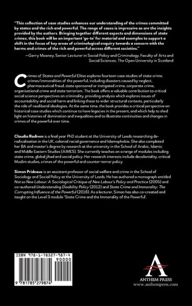 Acknowledgements; List of Contributors; Introduction, Claudia Radiven and Simon Prideaux; Chapter One Disasters in Aberfan and Grenfell, Claudia Radiven and Simon Prideaux; Chapter Two Medico: Big Pharma and the Flint Water Crisis, Claudia Radiven and Simon Prideaux; Chapter Three Genocide: The Rohingya and Forced Sterilisation of Women of Colour in the United States, Claudia Radiven and Simon Prideaux; Chapter Four State Crime, Corporate Crime and Organised Crime in the United Kingdom, Saudi Arabia, Yemen and the Congo, Claudia Radiven and Simon Prideaux; Chapter Five Organised Crime: County Lines in the United Kingdom and the Problem of Bosnian 'Peacekeepers', Claudia Radiven and Simon Prideaux; Chapter Six Colonial Crimes: The Treaty of Waitangi in New Zealand and Residential Schools in Canada, Claudia Radiven and Simon Prideaux; Chapter Seven Internment: Yarl's Wood and the Magdalene Laundries, Claudia Radiven and Simon Prideaux; Index.