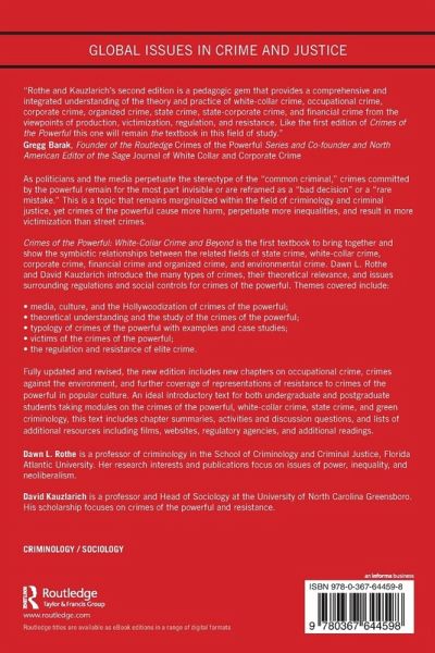 Crimes of the Powerful: White-Collar Crime and Beyond is the first textbook to bring together and show the symbiotic relationships between the related fields of state crime, white- collar crime, corporate crime, financial crime and organized crime, and environmental crime. Dawn L. Rothe and David Kauzlarich introduce the many types of crimes, their theoretical relevance, and issues surrounding regulations and social controls for crimes of the powerful. Themes covered include: