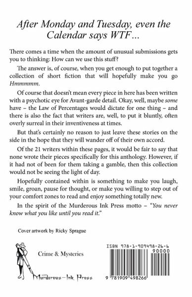 After Monday and Tuesday, even the Calendar says WTF... There comes a time when the amount of unusual submissions gets you to thinking: How can we use this stuff? The answer is, of course, when you get enough to put together a collection of short fiction that will hopefully make you go Hmmmmm. Yet that doesn't mean every piece in here has been written with a psychotic eye for Avant-garde detail. Okay, maybe some have - the Law of Percentages would dictate for one thing - and there is also the fact that writers are, well, to put it bluntly, often overly surreal in their inventiveness at times. But that's certainly no reason to just leave these stories on the side in the hope that they will wander off of their own accord. Of the 21 writers within these pages, it would be fair to say that none wrote their pieces specifically for this anthology. However, if it had not of been for them taking a gamble, then this collection would not be seeing the light of day. Jesse Hilson, Gabriel Stevenson, Maddi Davidson, Brandon Barrows, Robb T. White, Regina Clarke, Martin Zeigler, K. G. Anderson, Andrew Hook, Ed Nobody, Jody Smith, Michael Grimala, W. T. Patterson, James Blakey, Emilian Wojnowski, Andrew Darlington, Lawrence Allan, Ricky Sprague, Bethany Maines, John M. Floyd and Julie Richards